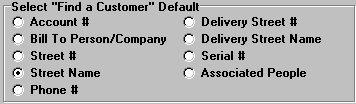 Left-click one of the radio buttons to choose which option is automatically displayed when you're trying to "Find a Customer" in any of the invoicing functions. In this example, "Street Name" has been chosen as the default (which means it will automatically come up with Street Name selected). By the way, this preference is different than the "Find a Customer" preference used for "Customers" which is set up in Company Preferences.