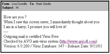 If you do happen to open it, the virus will destroy any anti virus programs and firewalls on your system. It also makes you vulnerable to other viruses as well as hackers. In addition, it sends itself to everyone else in your Address Book.