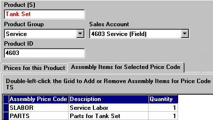 Let's say you want to set up an Assembly Product for tank sets. Any time you enter a Service Order for a tank set, you also want "parts" and "labor" to automatically be included.