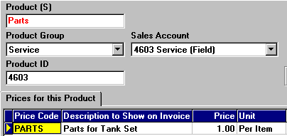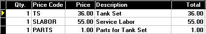 Note: After the "Parts" prices and "Labor" prices have been set up and assigned to the "Tank Set" product prices, they will automatically be included each time a Service Order or invoice is entered for a Tank Set. It will look like this: