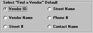 Left-click one of the radio buttons to choose which option is automatically displayed when you're trying to Find a Vendor. In this example, "Vendor ID" has been chosen as the default.