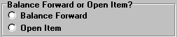 Left-click the appropriate radio button to choose whether payments are posted against the account balance (Balance Forward) or posted to a specific invoice (Open Item). There is a significant difference in the two approaches and the way you post payments is directly effected by the method you choose. By the way, the default is "Balance Forward".